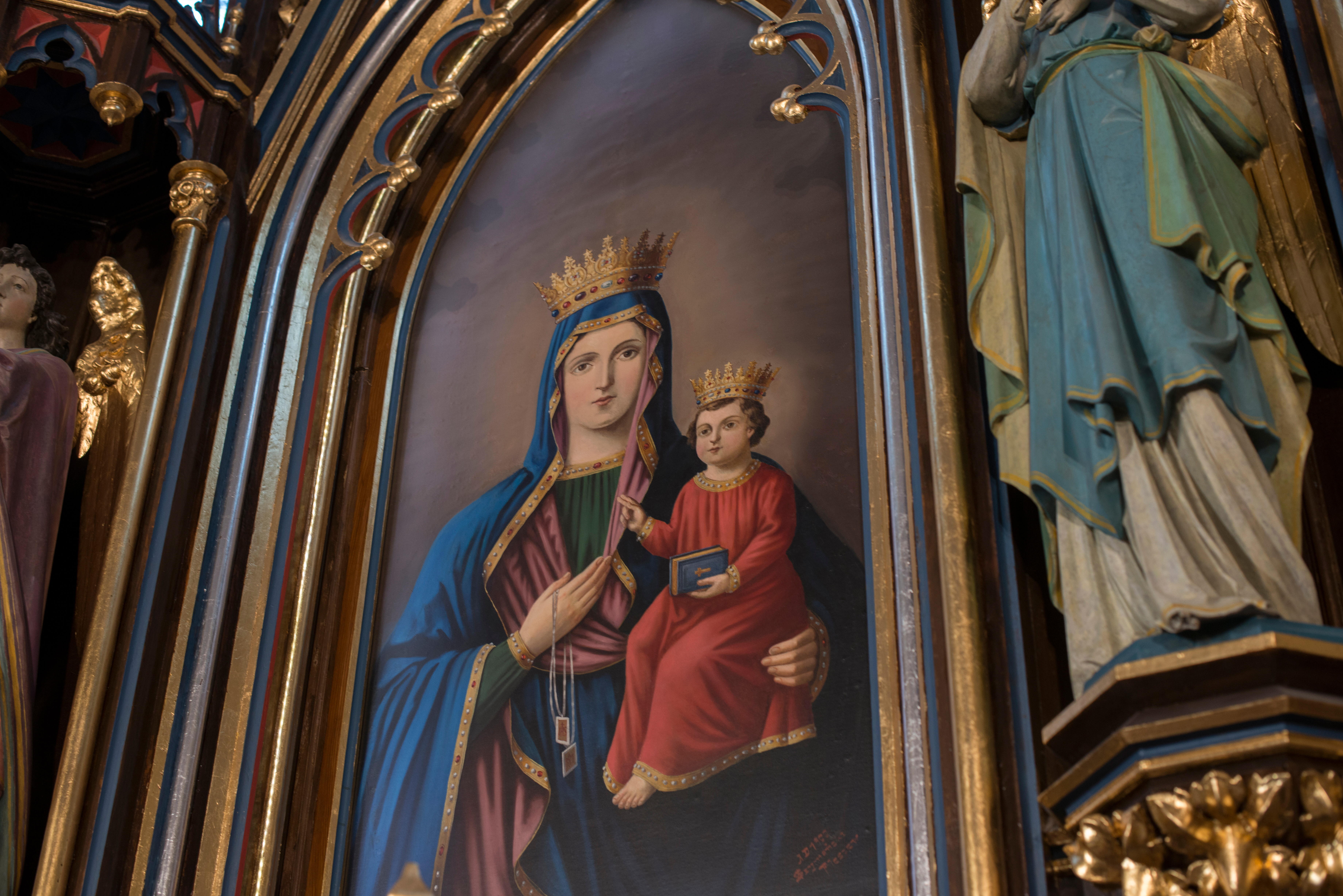 Dzieciątko uważnie przysłuchuje się zanoszonymi do Nich przez wiernych modlitwom, prośbom, skargom i obietnicom. Aby nie uronić ani jednego słowa wiernych postać Jezusa ma odsłonięte lewe ucho. Wyraz twarzy Obojga wskazuje, że słuchają wiernych z uwagą i w skupieniu. Sukienka Dzieciątka tzw. tunika, o wąskich, ujętych w mankiety rękawach, okrywa zgięte w kolanach nóżki, spod rąbka której widać tylko lewą stopkę. Niebieską okładkę trzymanego poziomo przez Dzieciątko kodeksu Ewangelii zdobi ciemnożółty krzyżyk. Brzegi kart kodeksu są również ciemnożółte.